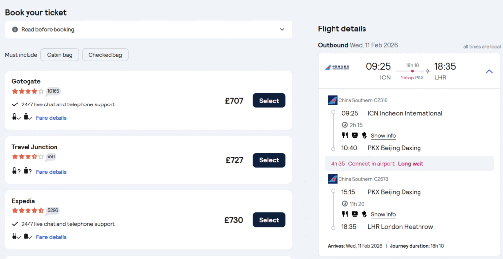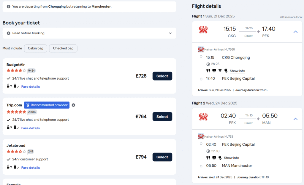 单程日期很多,往返比较难找。可以停留是优点,比如这个行程,从重庆去北京玩几天然后到英国圣诞、跨年。