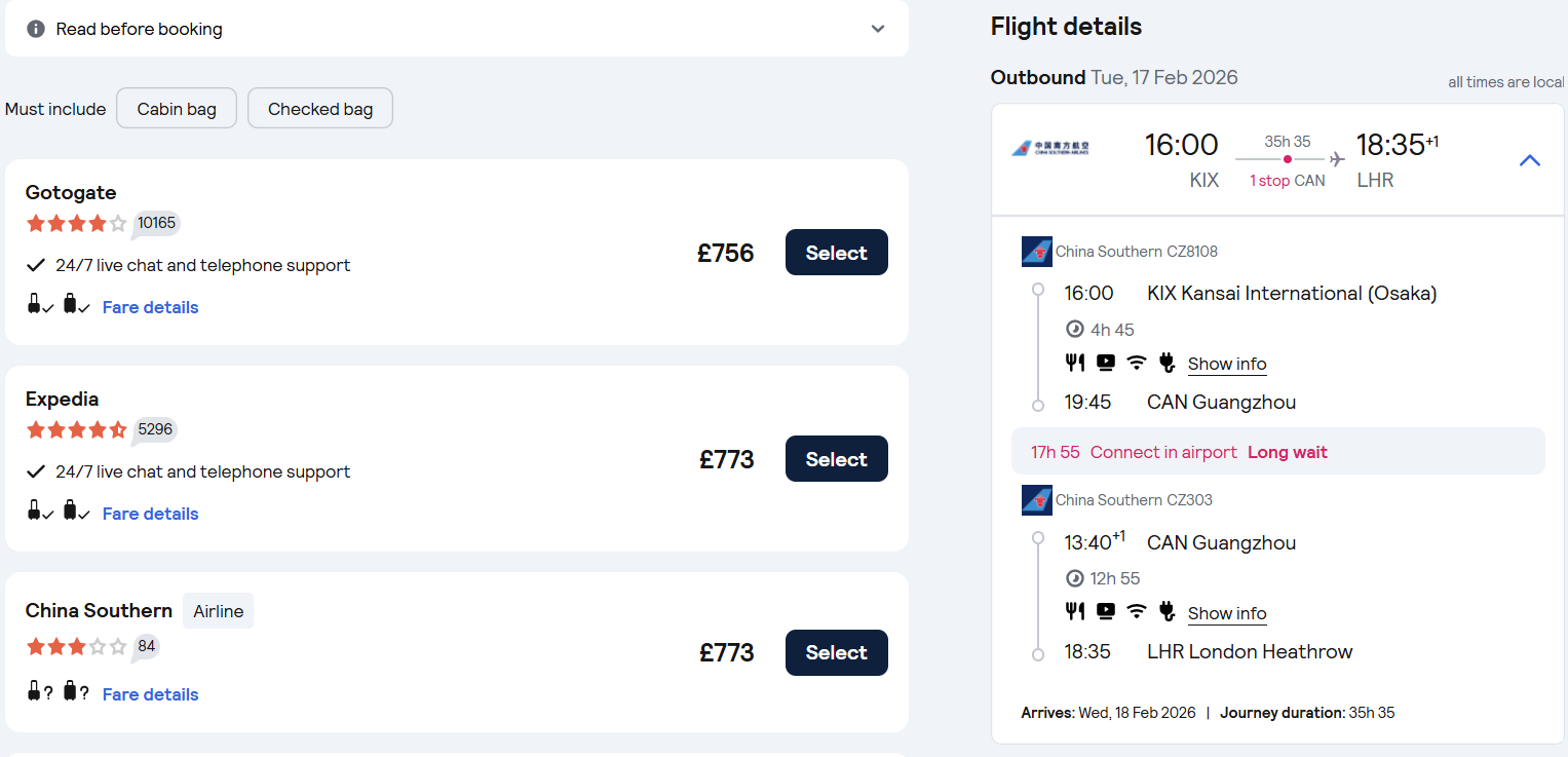 大阪出发有2月17日正春节飞伦敦的票,不过也是超长转机: