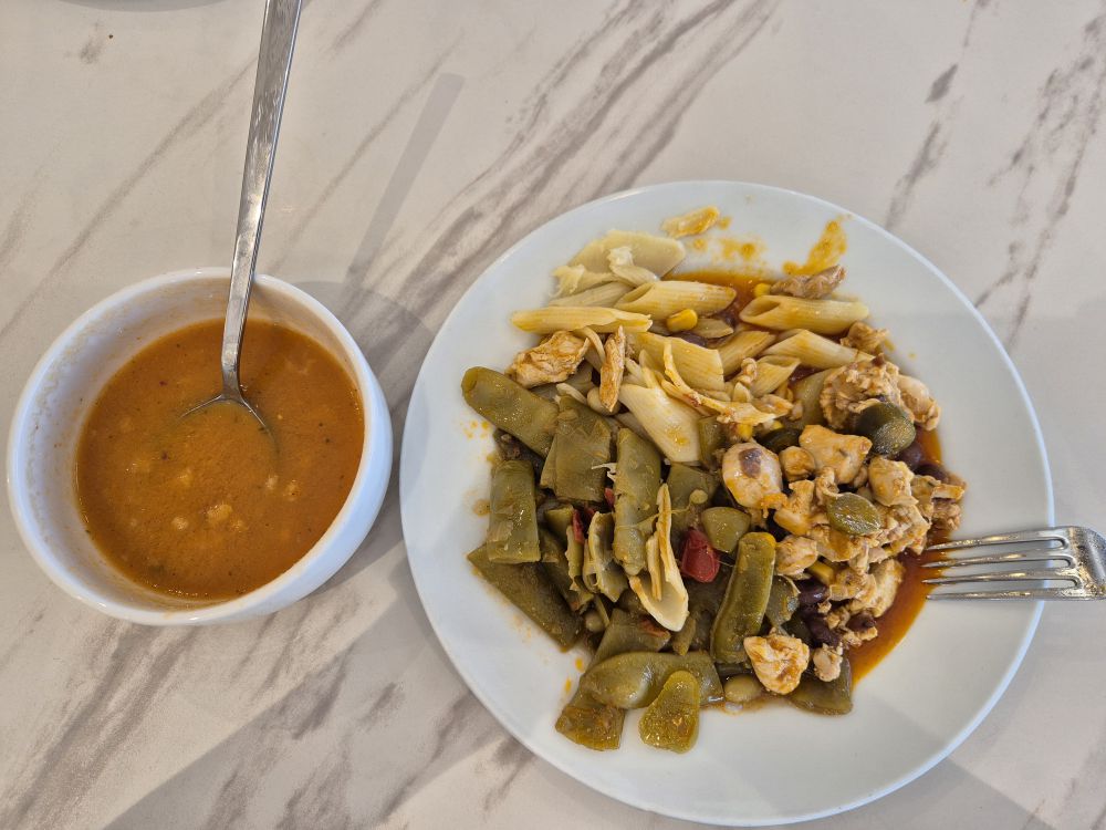 热食是烩扁豆,墨西哥风味烧鸡和意大利面。看起来平平无奇但意料之外得好吃,调味很棒!