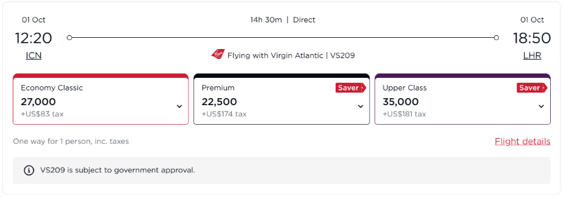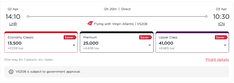我们重点关注的当然是里程票。维珍在一年前引入了动态兑换机制,定价非常“随机”:低价的时候便宜到离谱,高价的时候昂贵得疯狂,还经常出现比如经济兑换比高舱更贵的倒挂情况。而且不止是点数,税费也是动态的。