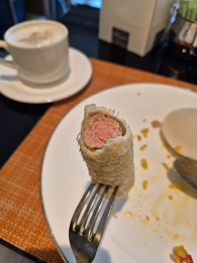 看到了春卷想说来个尝尝,咬一口发现里面夹了根火腿肠哈哈,这是什么操作。