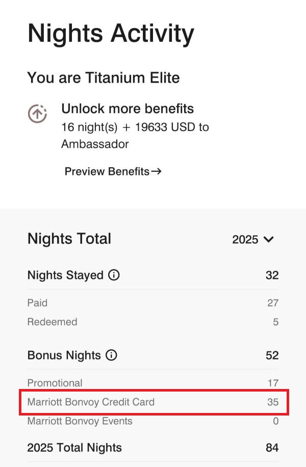 没错,直接75晚,每年一晚酒店都不用住就保级钛金了。当然以上情况比较极端,个人的搭配是Currensea普卡+Chase+中信精逸白金,每年信用卡组合可到手35个房晚。卡片到手激活后房晚秒入账: