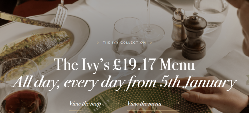 明年Ivy即将推出一个主题活动,旨在纪念1917年开业,特地推出了£19.17的盛惠套餐,活动日期为1月5日至2月28日。