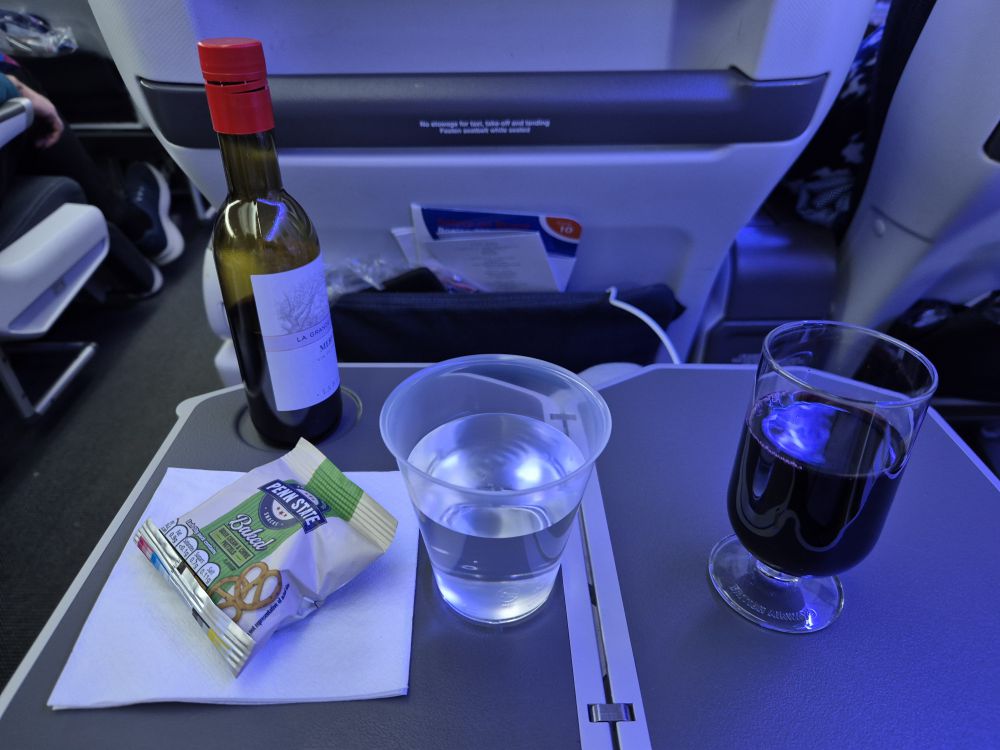 说说餐食吧,登机后空乘会送上气泡酒,果汁以及小毛巾,待遇等同商务舱。