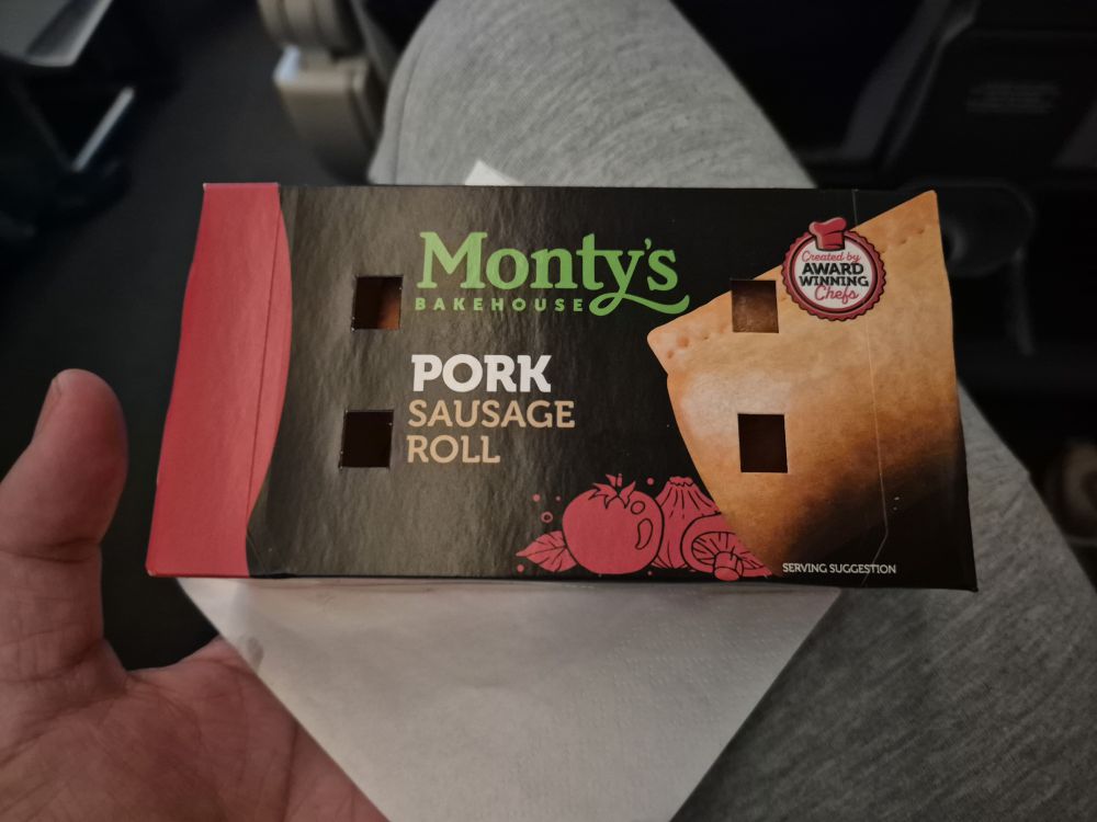 降落前一个半小时放第二顿简餐:猪肉肠卷或者洋葱奶酪派。