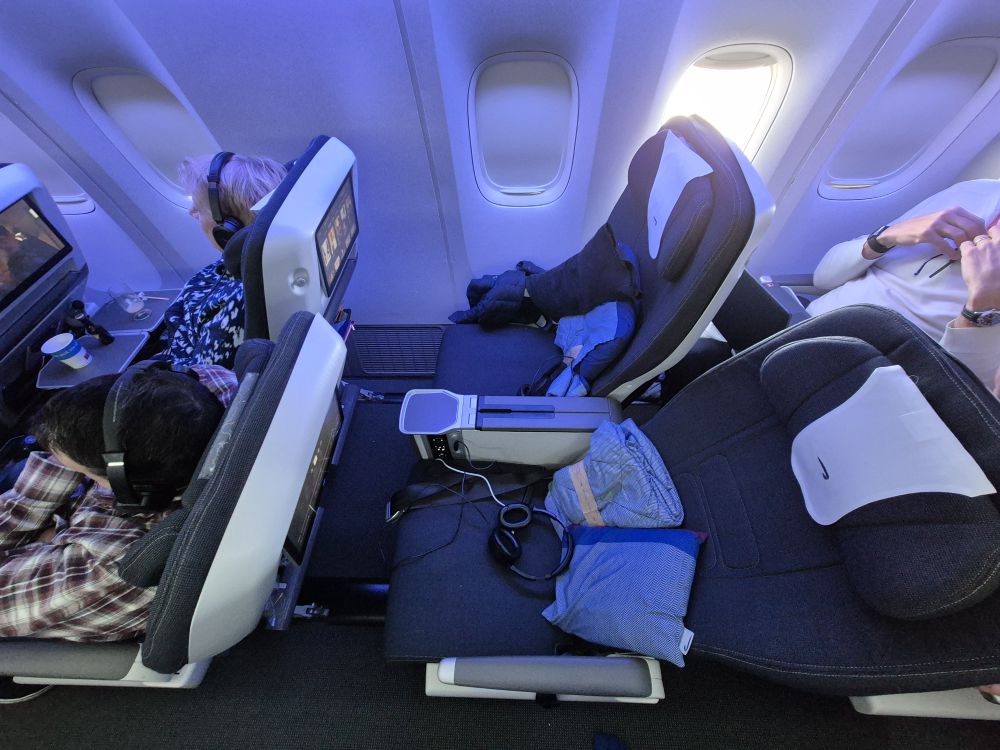 超级经济舱当然是无法躺平的,目测最大斜躺角度为120度左右。同时提供有脚部和腿部支撑,但说实话对于个子高的人来说反而是累赘。