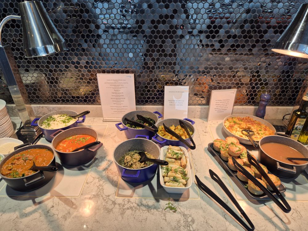 在疫情之后英航的商务舱休息室已经结束了单点服务,回归自助模式而且感觉越来越难吃了。头等舱休息室则仍然采用自助和单点混合模式。午餐时间段的自助包括越南咖喱,春卷和英式鸡肉派等。
