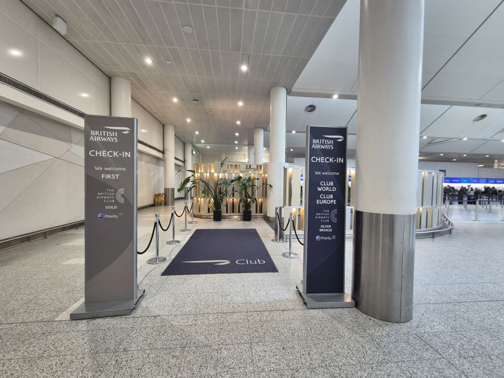 英航加勒比的航班似乎多数从盖特威出发,所以错过了T5 First Wing的体验,但盖特威的头等舱休息室刚好我也还没去过。从伦敦桥搭火车到盖特威机场站,下车之后就抵达南航站楼。作为希思罗以外的第二基地,英国航空在这里为两舱乘客设置了专门的值机区域。