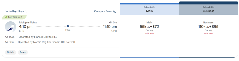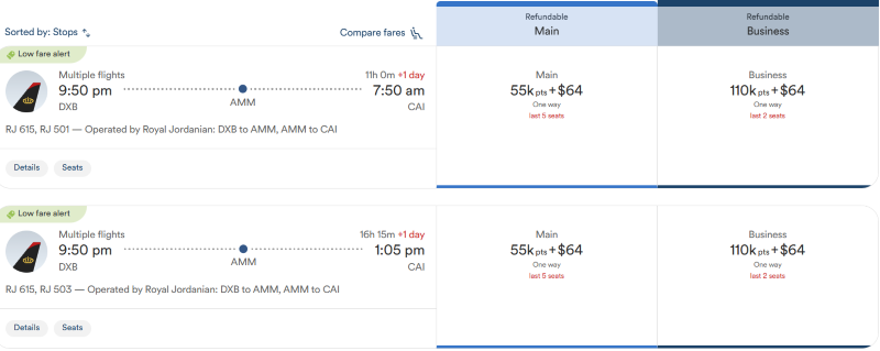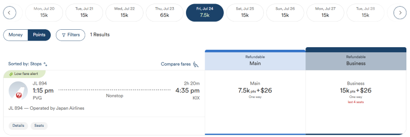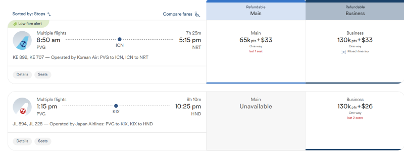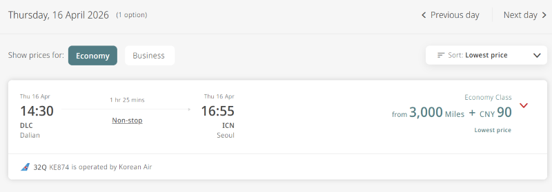 主要是短途的经济舱特别便宜,比如大连到首尔,经济舱 / 商务舱只要3,000点 / 7,500点,税费也只要90块。