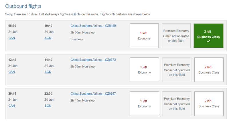 似乎只有境外航线放了商务舱的票,比较奇怪。话说回来,Avios换南航的主要亮点还是在短途经济舱,这些商务的票性价比都一般吧。