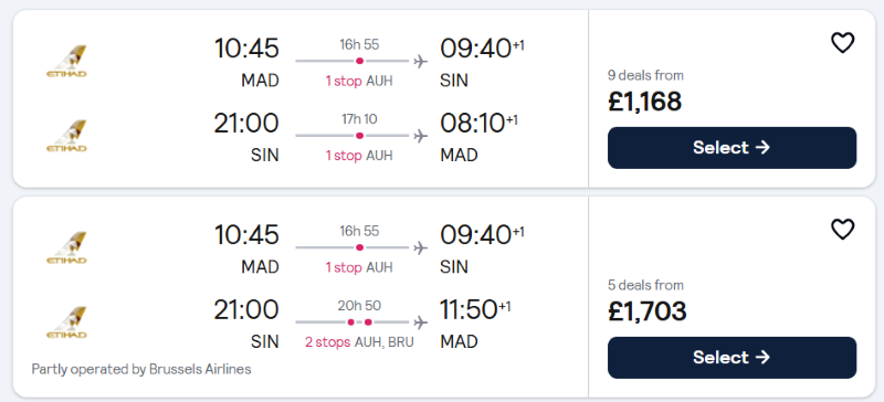 - 马德里 – 新加坡 £1,168