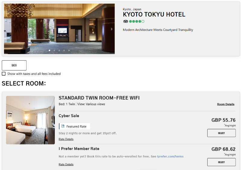 The number of participating hotels isn’t very large, and a few of them don’t seem to have any availability at all. Some of the hotels are very reasonably priced. For example, Japan’s Kyoto Tokyu Hotel is just over £50 per night: