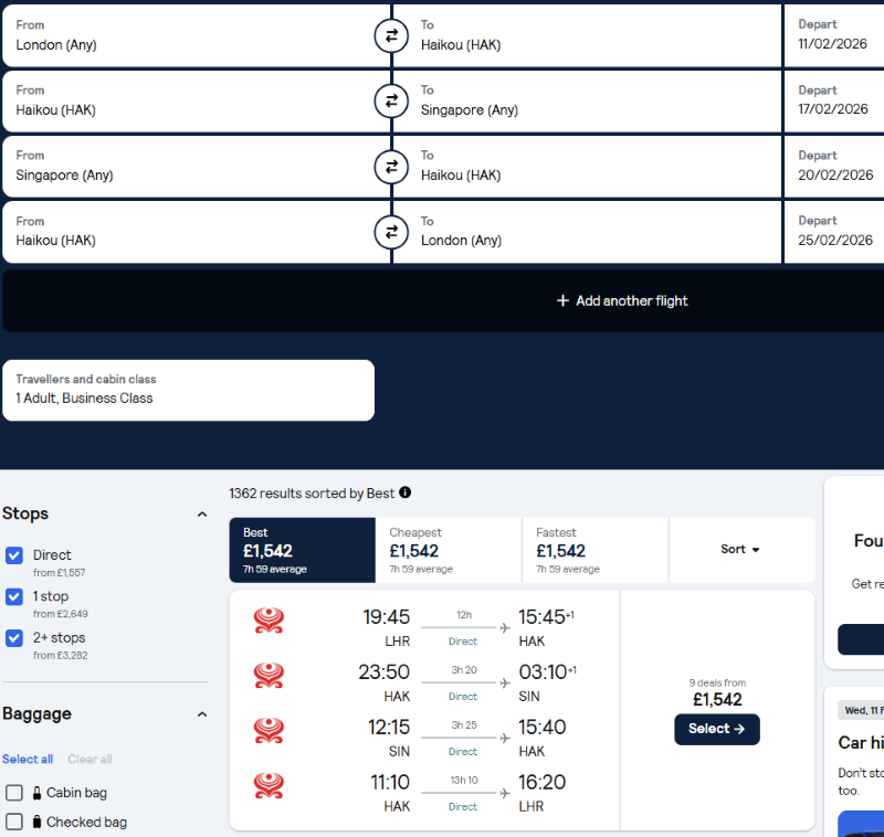 - London – Singapore round trip, with a connection in Haikou (or Changsha)