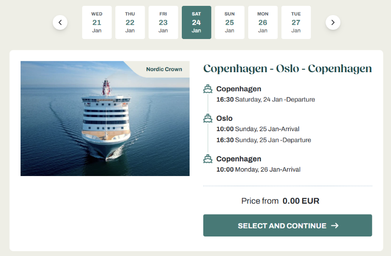 Sporadic dates are available throughout the whole year. For example: Copenhagen – Oslo – Copenhagen mini-cruise, January 24: