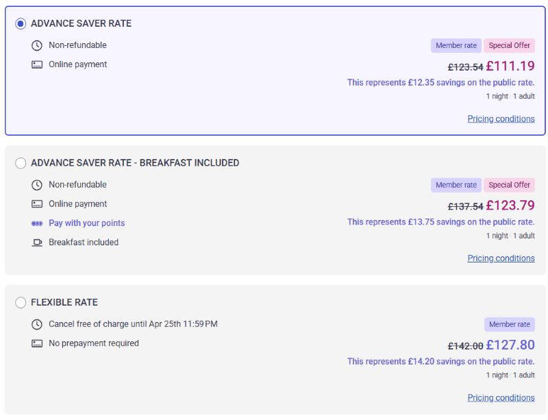 Do note that you must book a non-refundable prepaid rate to trigger the bonus. On the promo page, you can search for hotels, and the qualifying rates are marked with a pink “Special Offer” label.